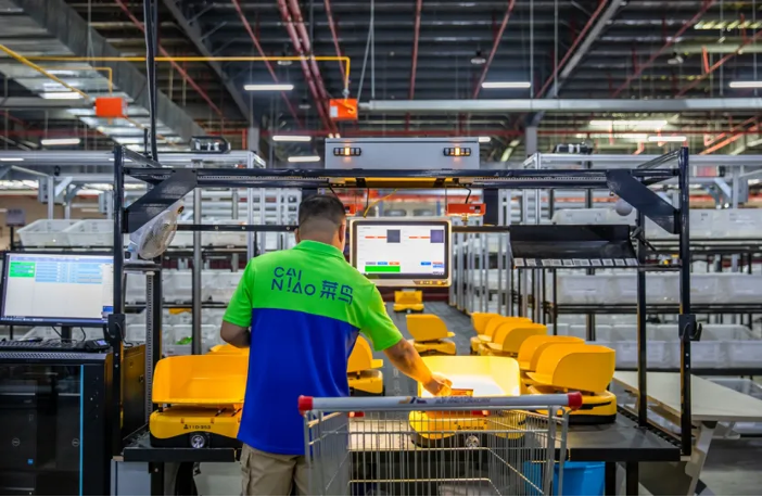 The intelligent warehouse management system and AGV robots deployed in the Cainiao warehousing center.
