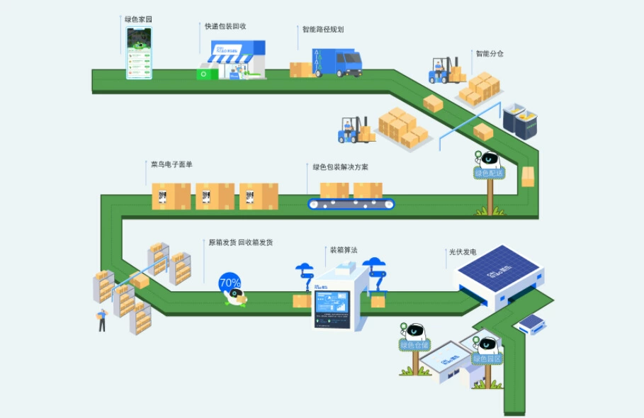 菜鸟制定了明确的碳减排目标和实施路径,积极应对气候变化挑战,同时专注自身行业特点,积极开展绿色物流实践,持续完善自身全链路绿色物流解决方案,联合价值链上下游伙伴推动绿色发展。